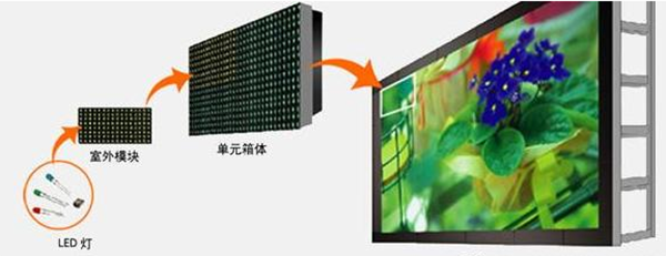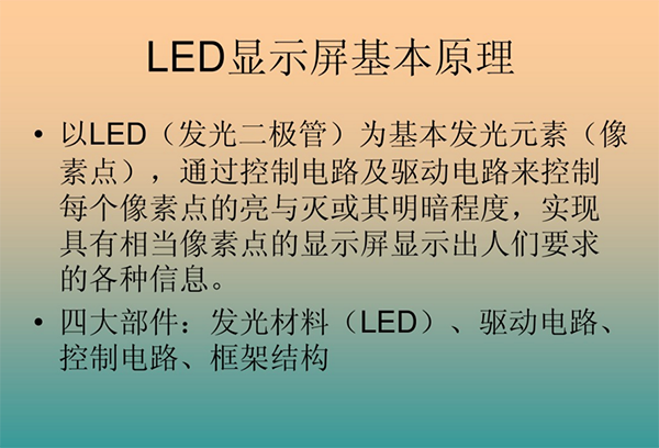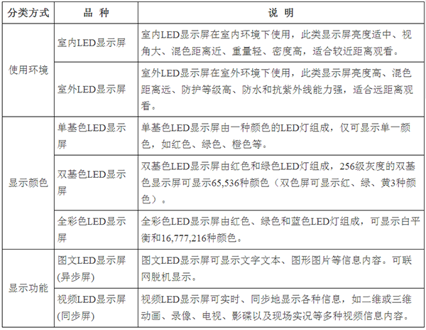 通过不同颜色的发光二极管能够组成不同的显示屏,双基色是由红、绿或黄绿两种颜色组成、伪彩是由红色、黄绿、蓝色三种不同颜色组成、全彩是由红色、纯绿、纯蓝三种不同颜色组成。