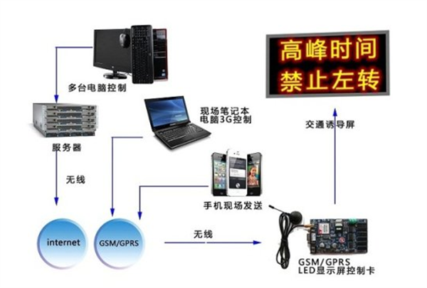 在基于移动通信的GPRS数据网络上,将我们LED显示屏的数据通过GPRS收发模块进行数据通信,可以实现远程异地的点对点的小量数据传输,达到远程控制的目的;
