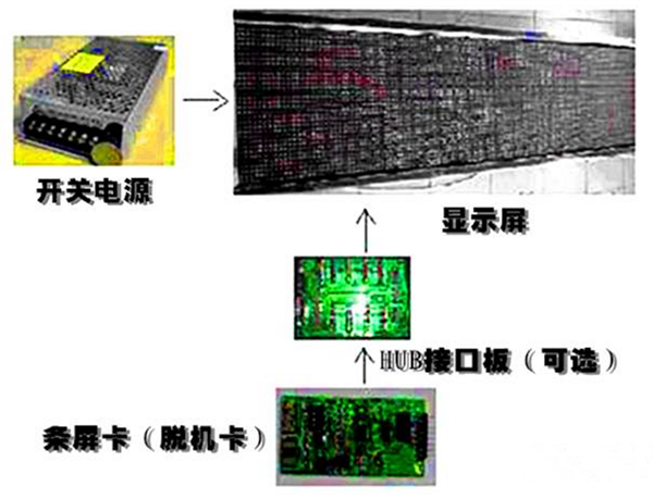 一般由显示单元板(模组)、条屏卡、开关电源、HUB板(可选)组成。通过串口线与计算机连接,进行显示文字的更改,之后可以脱开计算机工作。