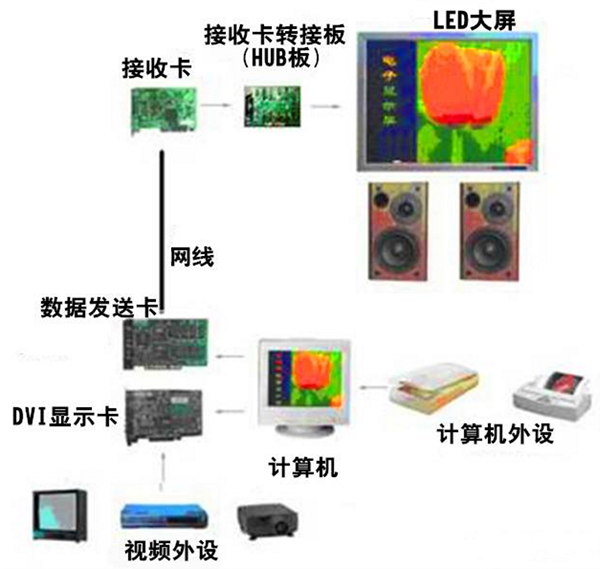 同步屏系统比较复杂,系统可大可小,一般由计算机、DVI显卡、数据发送卡、同步数据接收卡、HUB板、网线、LED显示屏等组成。系统始终需要联机计算机工作,将计算机上的图像文字显示在LED大屏幕上。